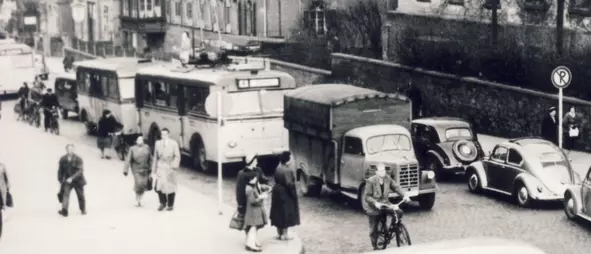 An ihrem letzten Tag, dem 3.4.1953, befördert die Straßenbahn ihre Fahrgäste zum Nulltarif. In den 1950er Jahren ist der Obus das wichtigste Nahverkehrsmittel in Gießen und gilt als zukunftsweisende Betriebsart. Omnibusse mit Anhängern werden erstmalig einsetzt.