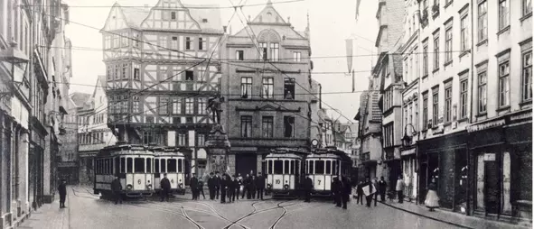 Die „Elektrische“ Straßenbahn nimmt ihren Betrieb auf. Es werden zunächst zwei Linien eingerichtet - eine rote und eine grüne Linie. Durch Gleise und Kriegerdenkmal geht die eigentliche Funktion des Gießener Marktplatzes endgültig verloren: Er ist nun Verkehrsknotenpunkt.